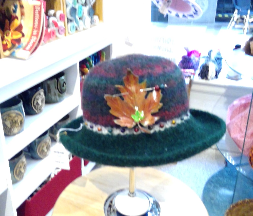 Felt hat measures 22" around with beads and is 7 1/2" high. Leather leaf pin included. Spot wash.
