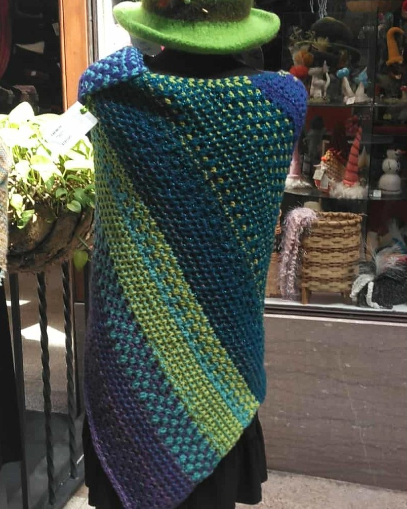 63 " across the top by 55" long Multi color jewel tones- Wool/acrylic mix. Hand Wash lay flat to dry.